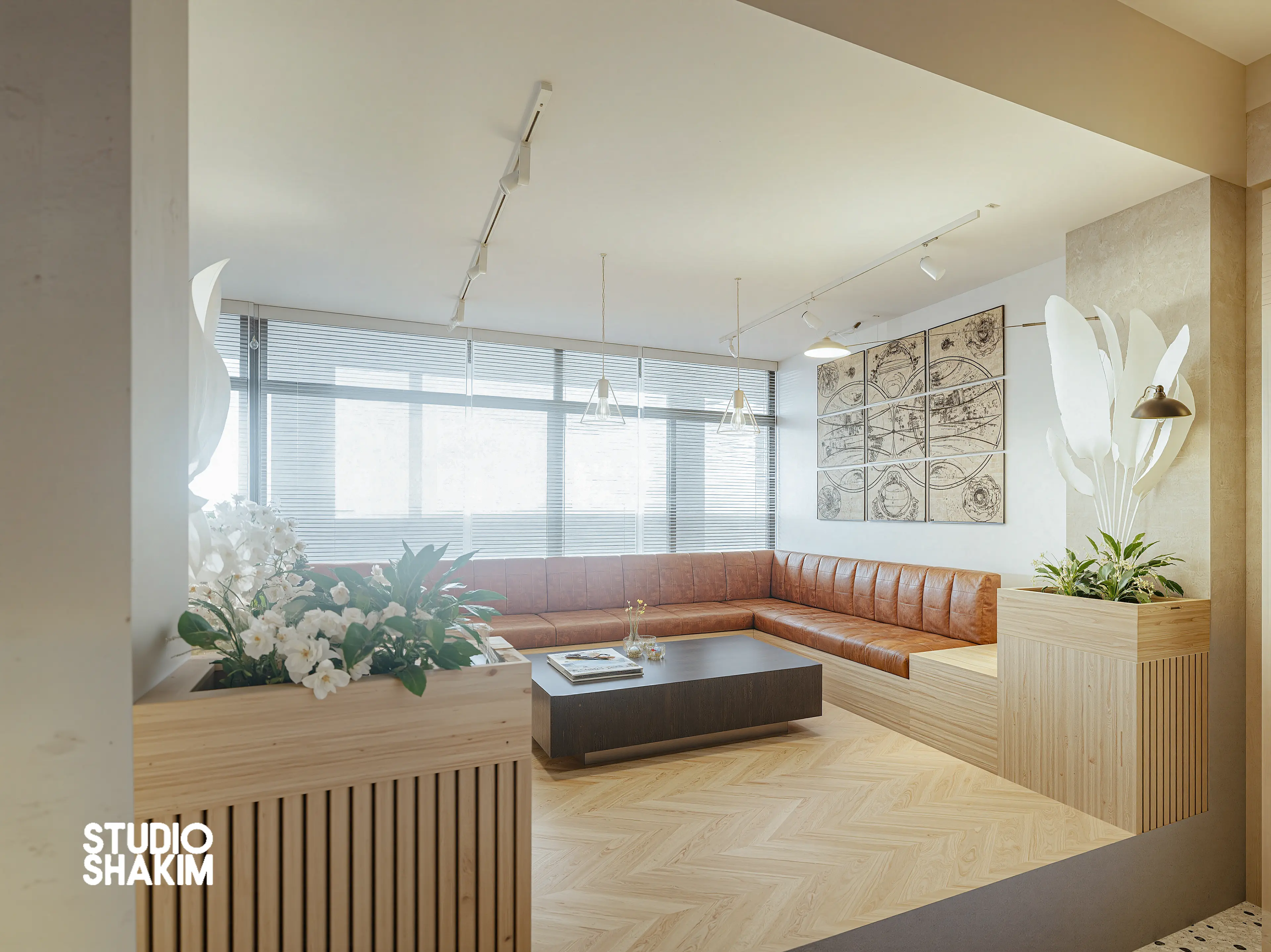 Warm wood tones and soft leather seating invite you in, while bold colors and refined lighting bring energy and personality to the room. Plants and natural textures soften the space, making it feel alive and welcoming. The layout flows effortlessly, guiding you from intimate corners to open gathering areas without breaking the harmony.